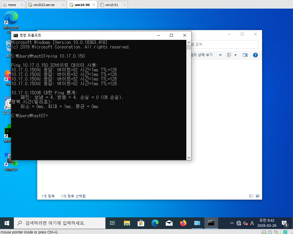 - Win Client(10.17.1.150)에서 Win server(10.17.0.150)으로 값이 가는지를 확인한다.