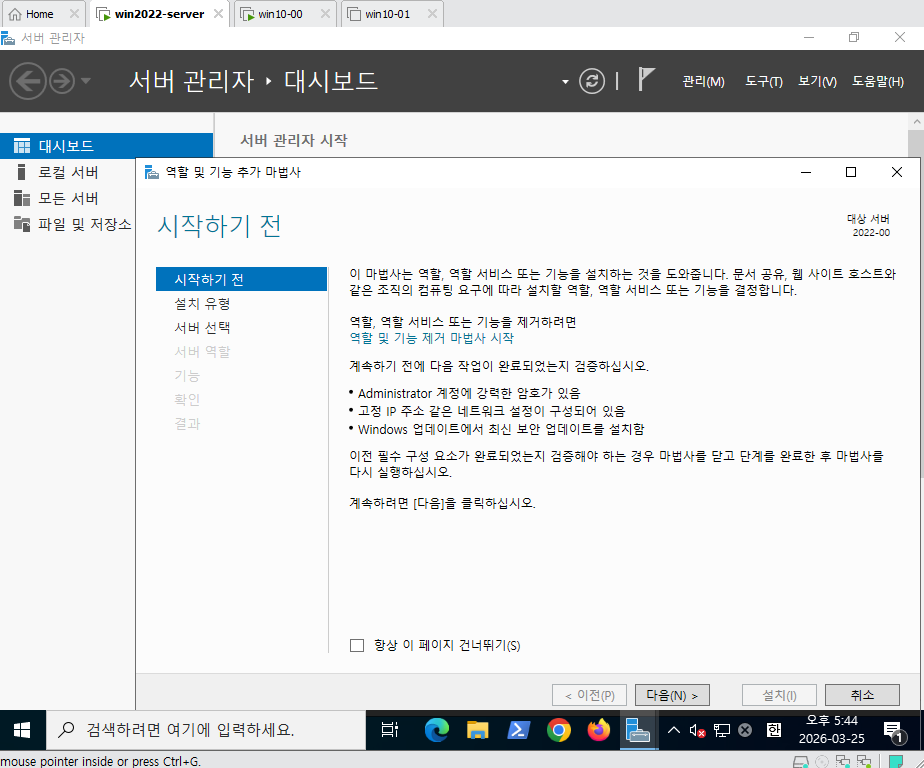 - Win server에서 역할 및 기능 추가를 클릭한다.