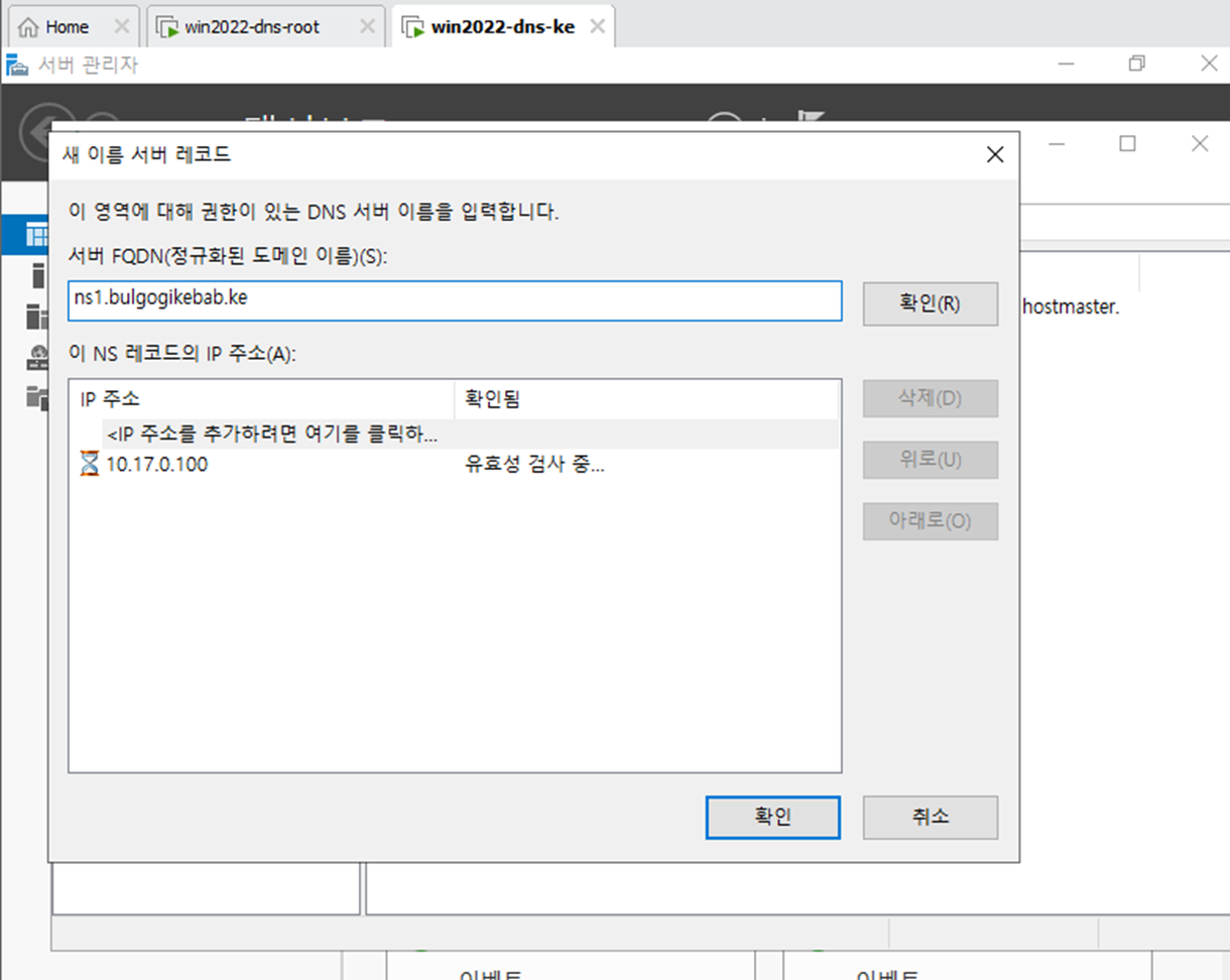 - 새 이름 서버 레코드를 켜서 FQDN에 들어가서 IP 주소를 입력한다. 10.17.0.150은 위임해줄 dns-ke의 주소이다.