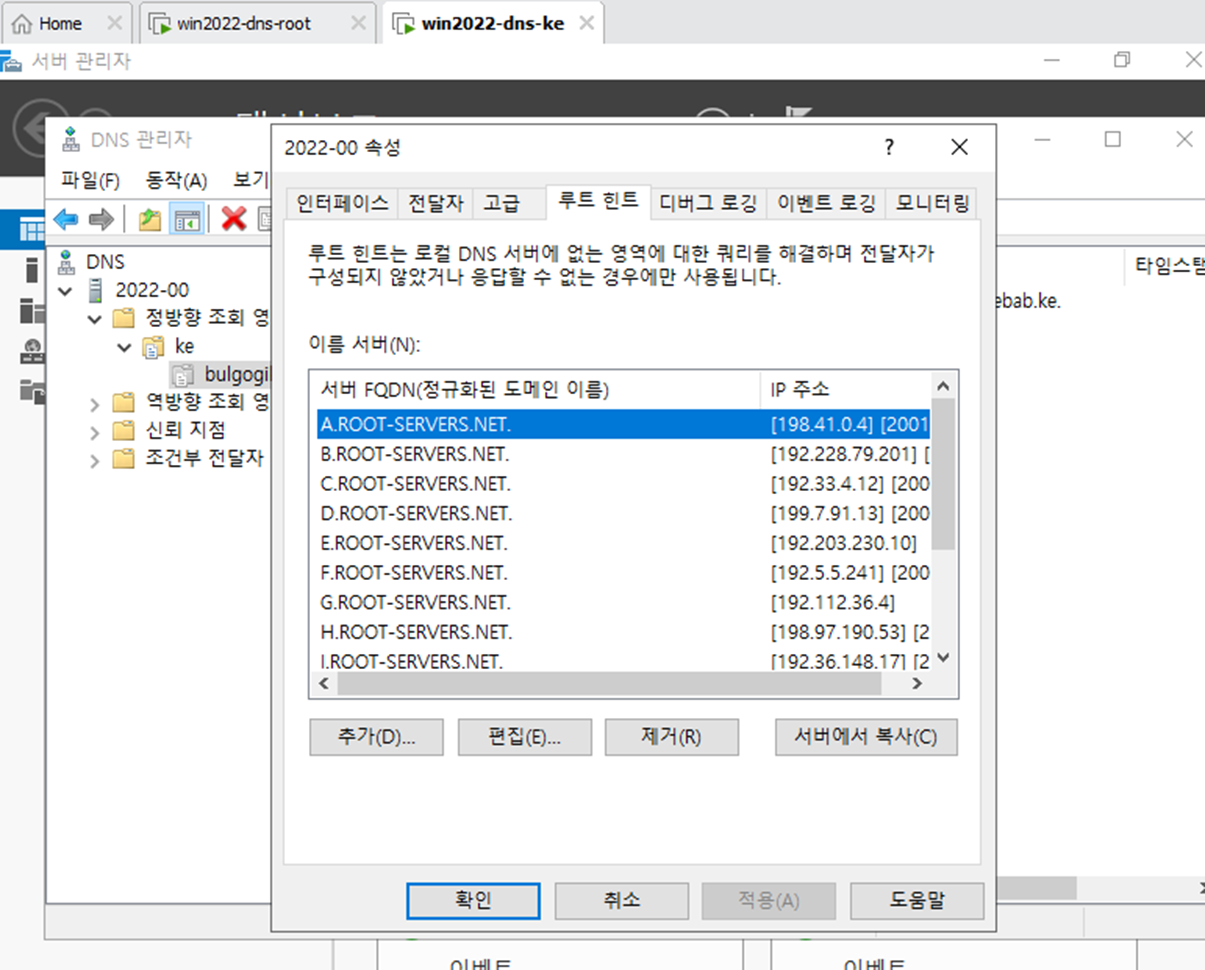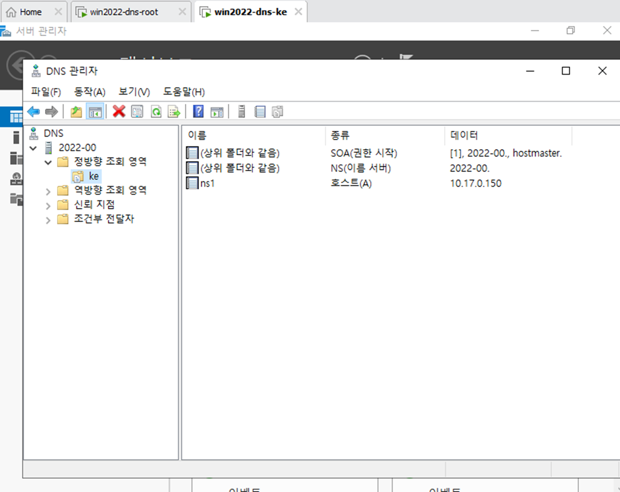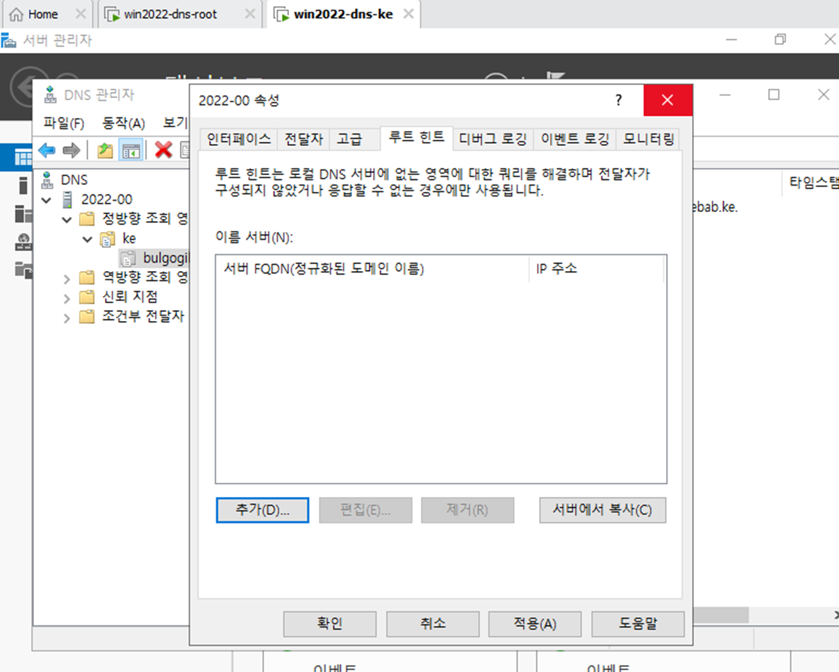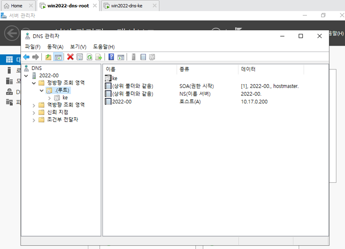- 서버 관리자에서 DNS 서버를 다운 받는다. Root와 DNS-ke 둘다 다운되어 있어야 한다.