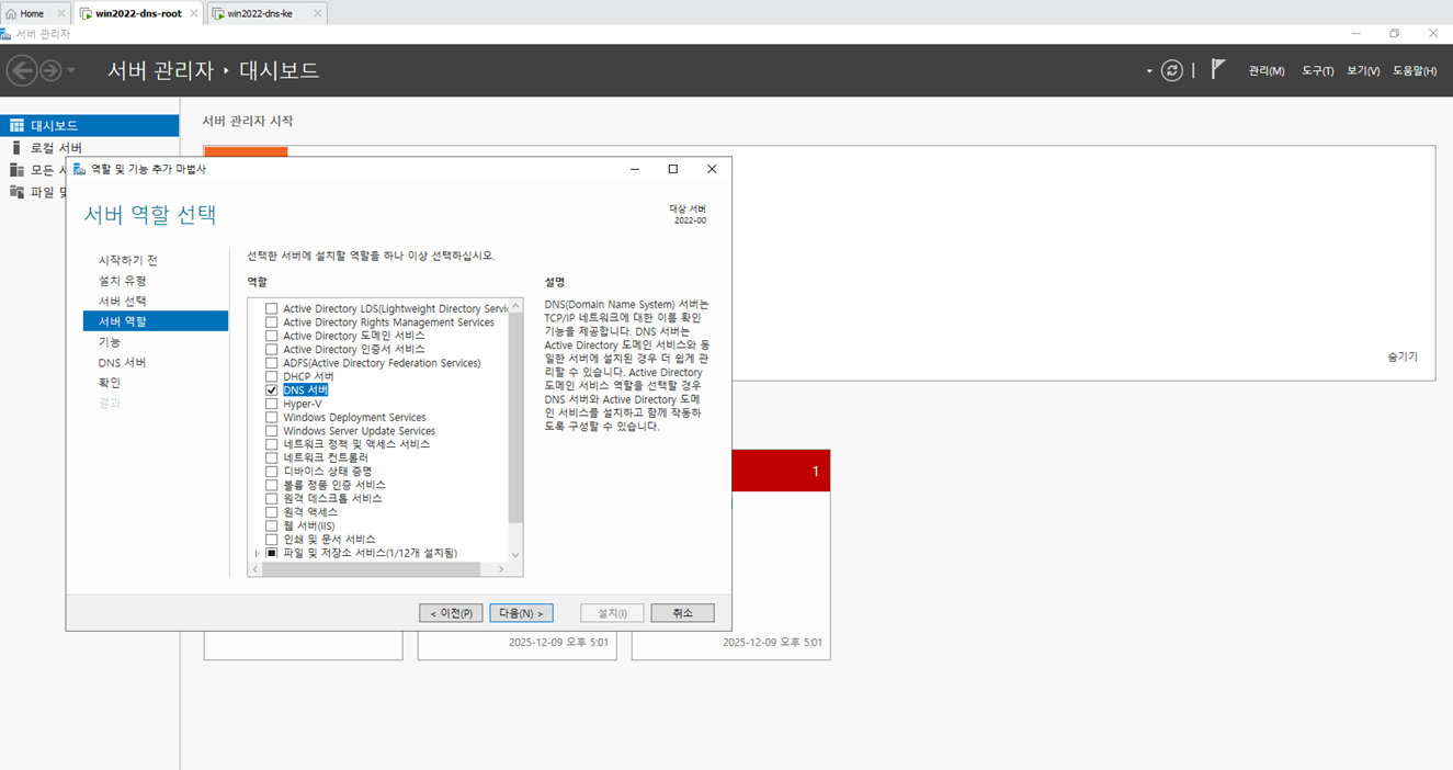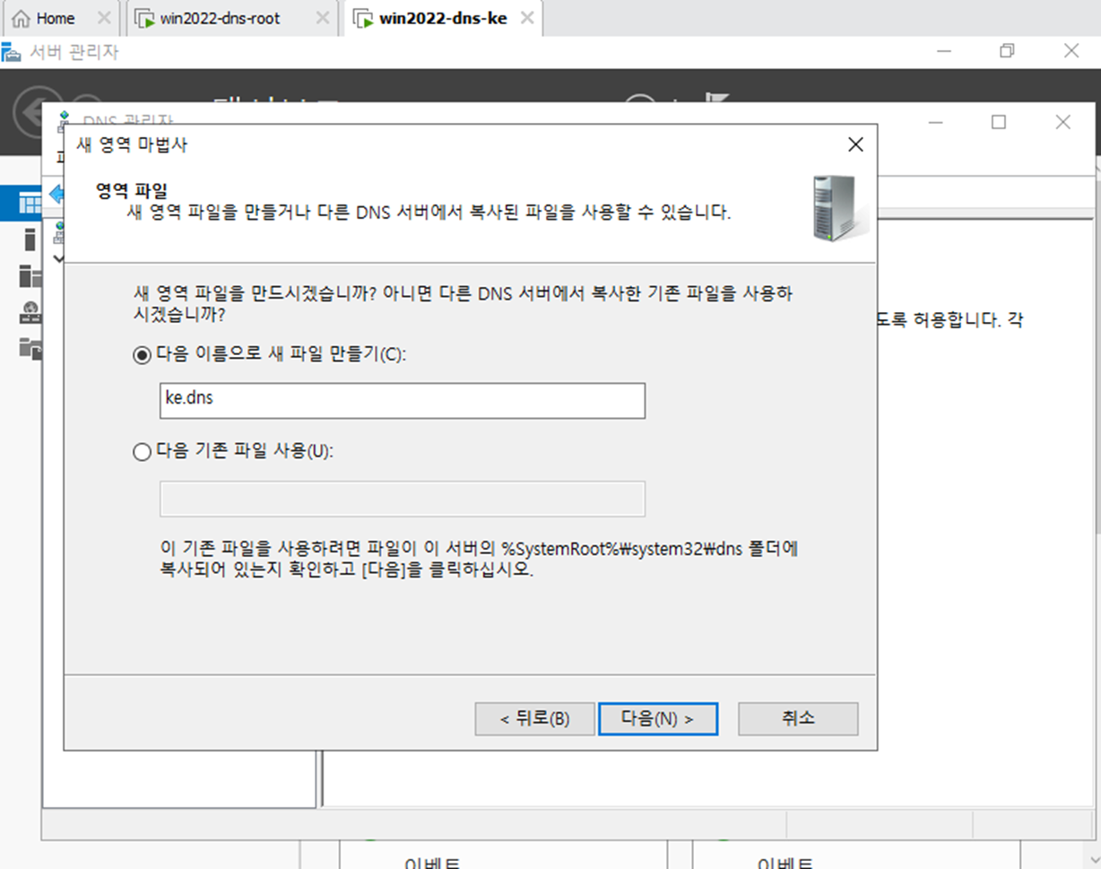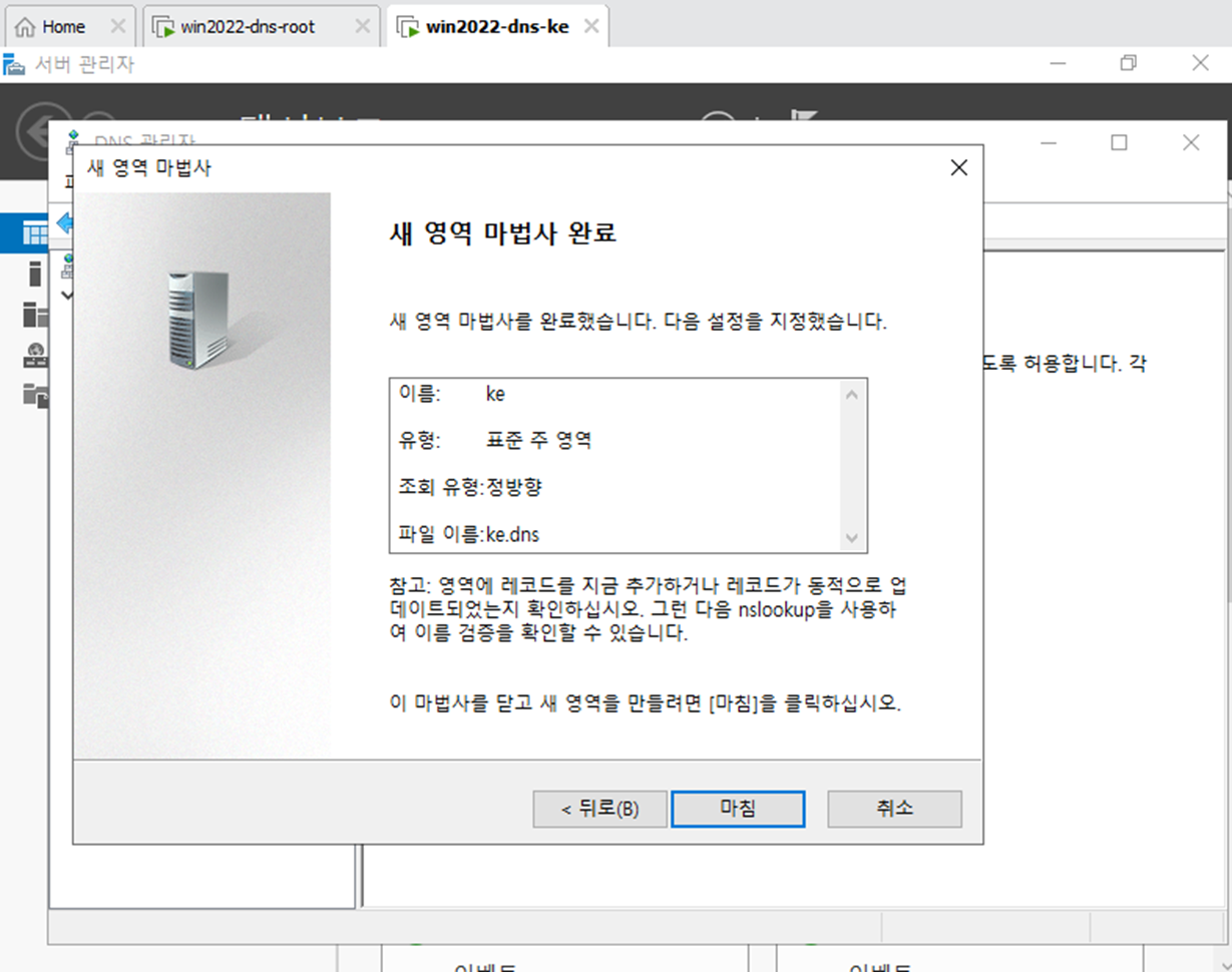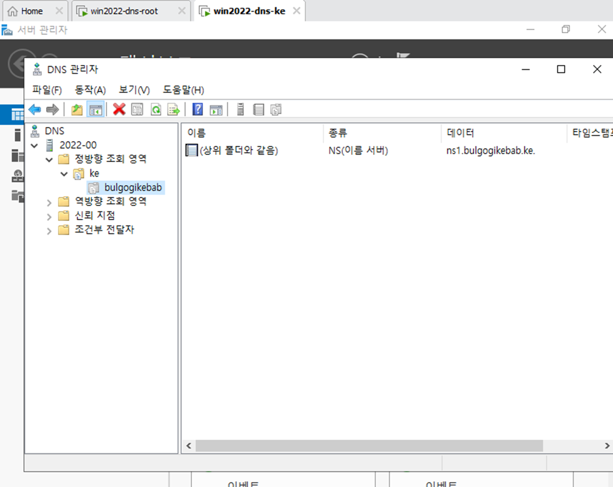 - 서버 관리자에서 DNS 서버를 다운 받는다. Root와 DNS-ke 둘다 다운되어 있어야 한다.