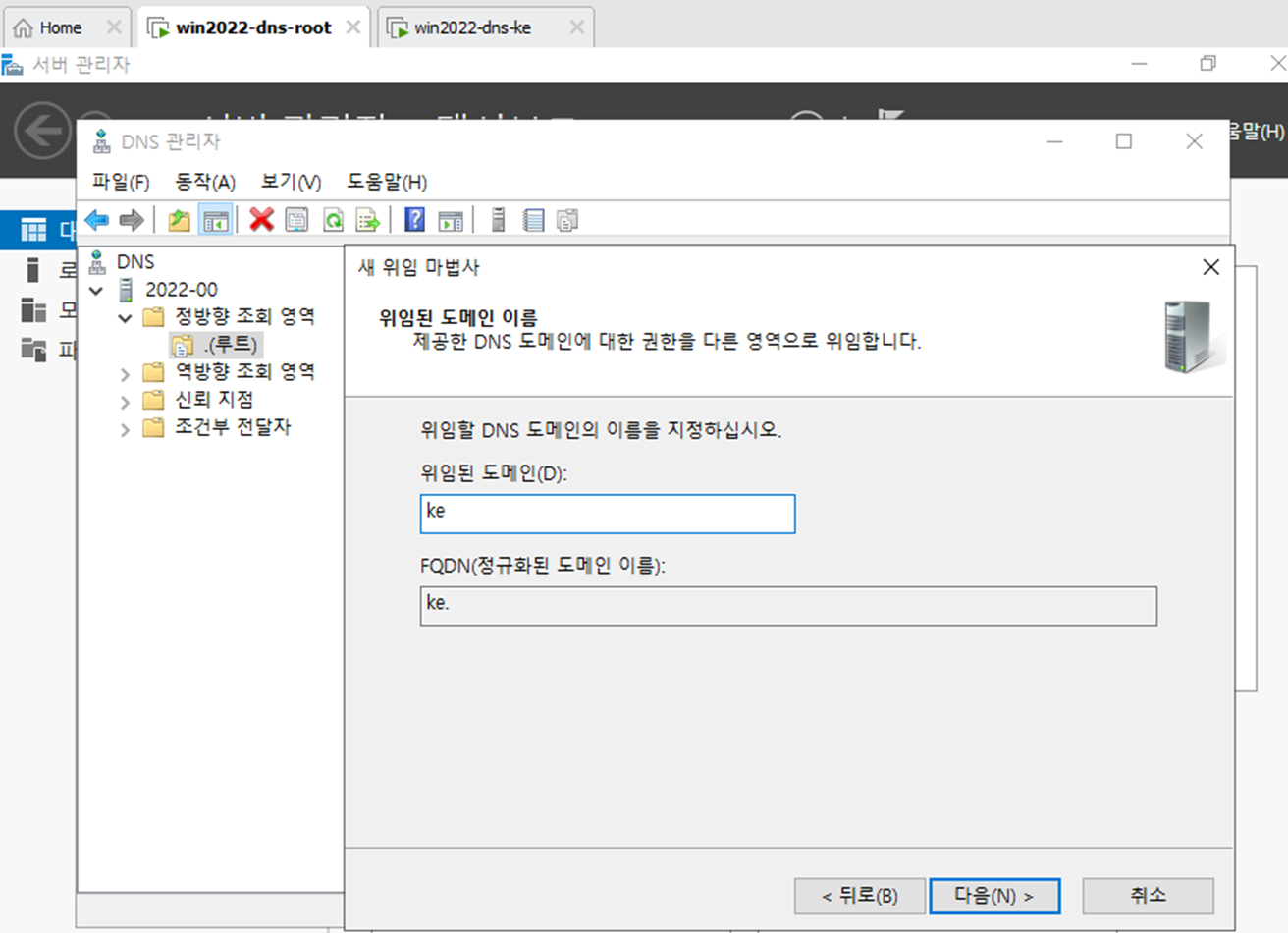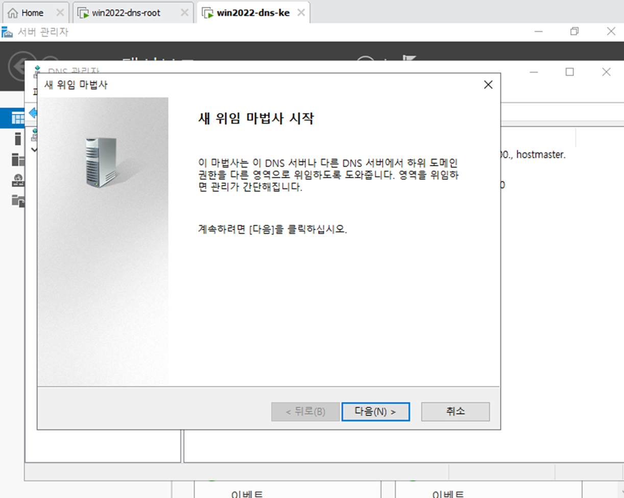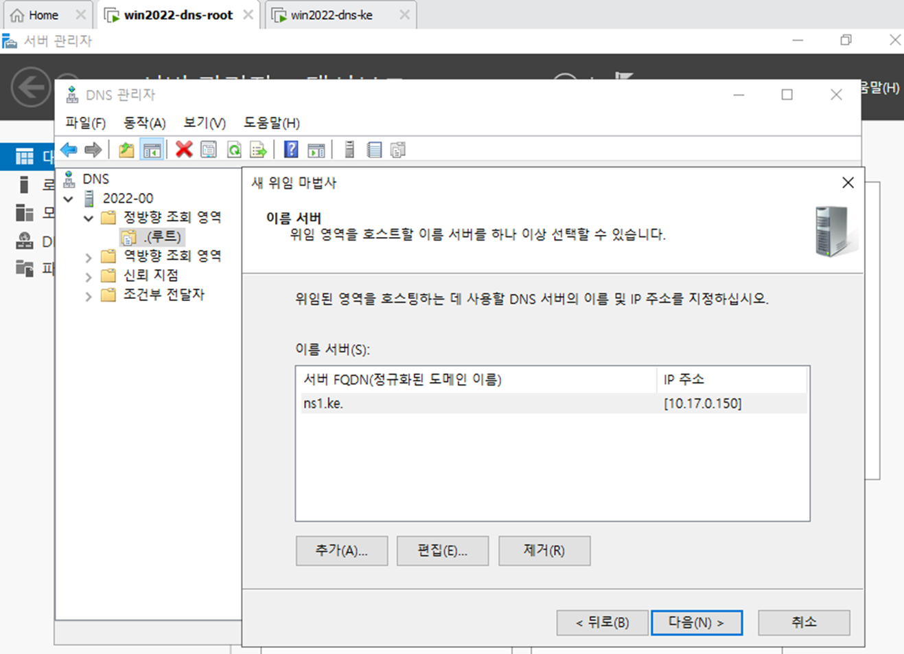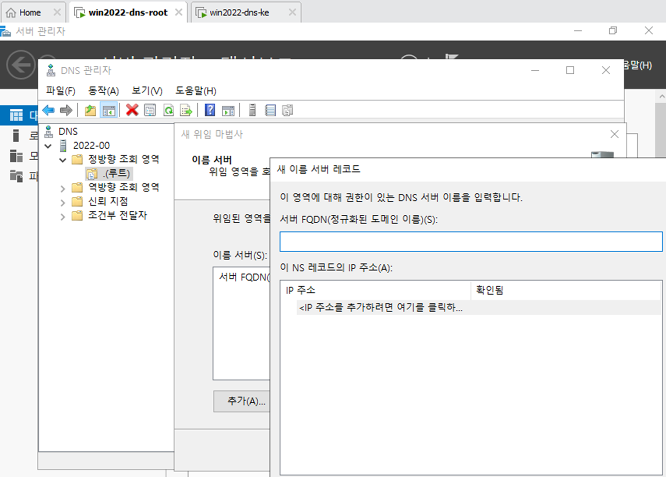 - 서버 관리자에서 DNS 서버를 다운 받는다. Root와 DNS-ke 둘다 다운되어 있어야 한다.