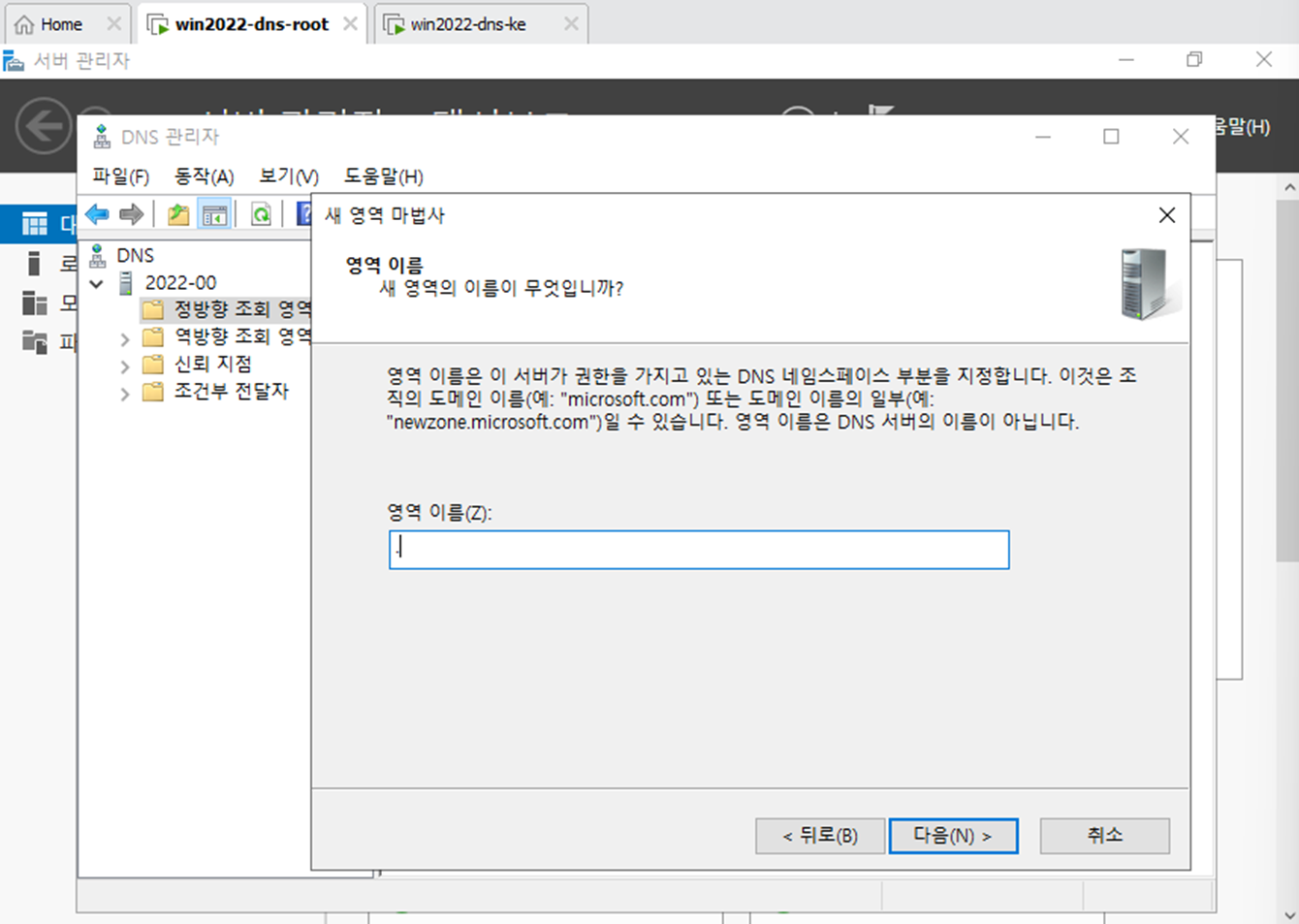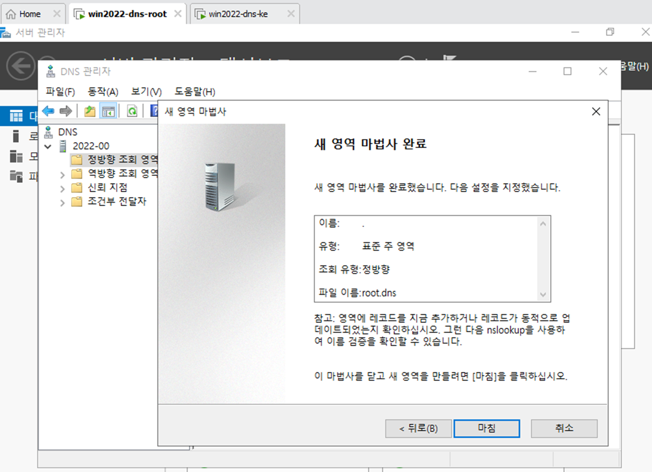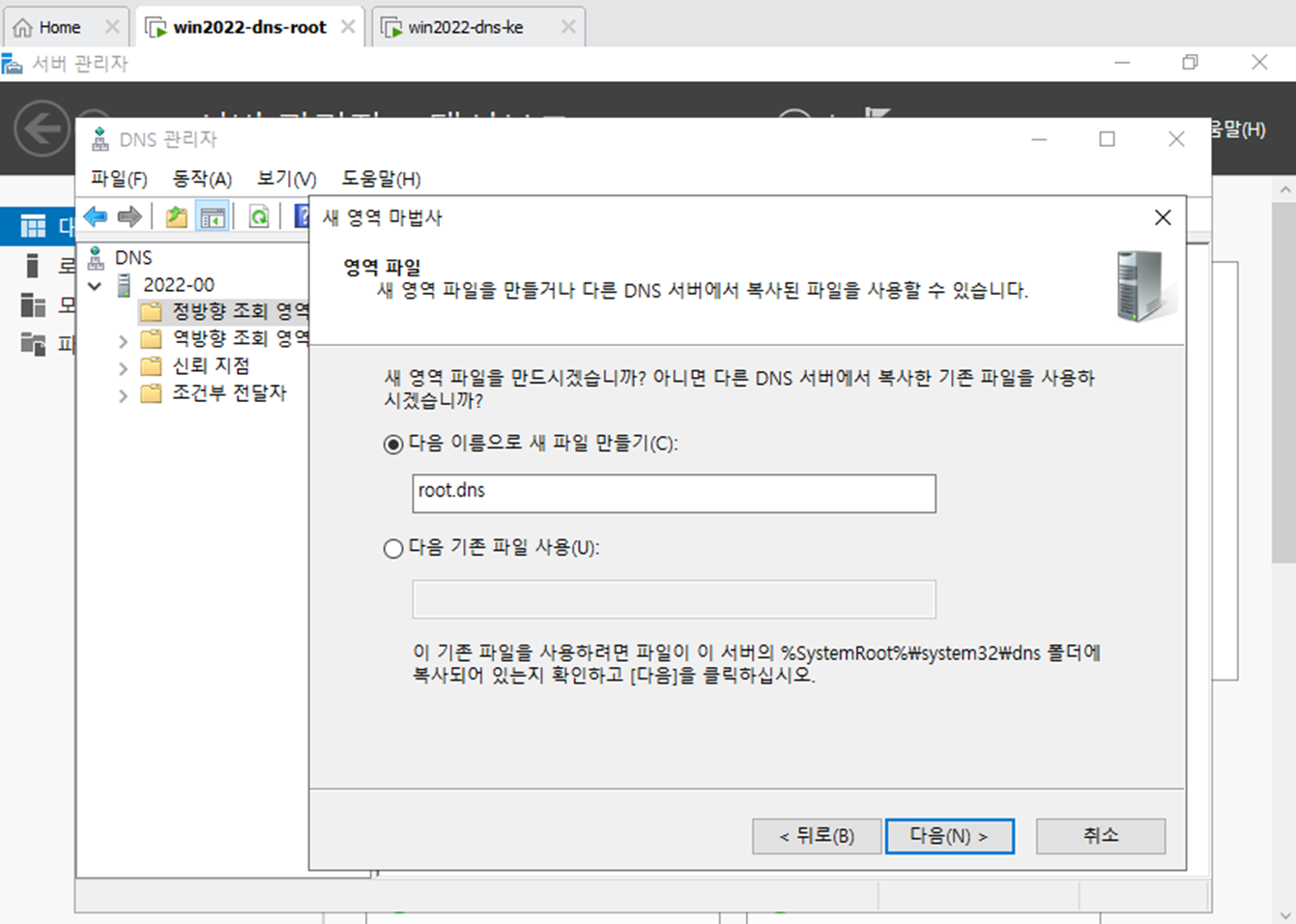 - 영역 이름 . 이름 root.dns,이라는 새로운 영역을 만든다.
