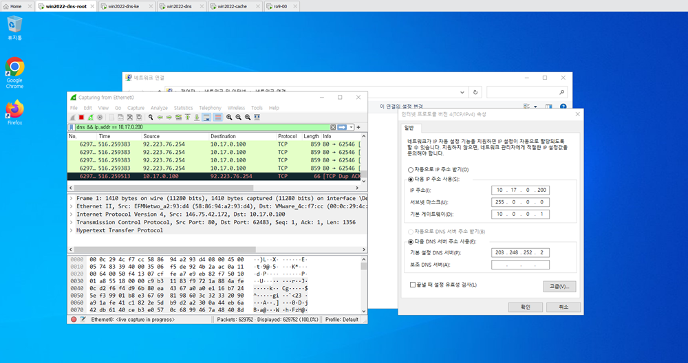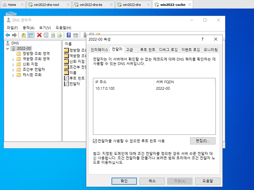 - 전달자를 조정한다. 기존에는 10.17.0.100번으로 DNS사 가 설정되어 있었는데 캐시는 10.4.0.200번을 바라보도록 변경했다.