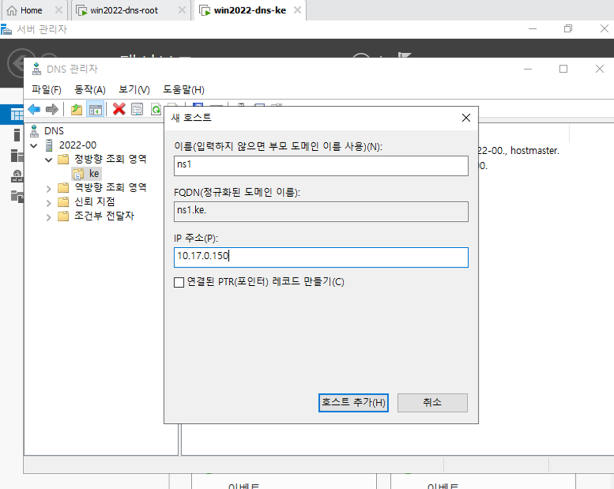 - 새 호스트 등록을 한다. ns1.ke(10.17.0.150) 으로 등록한다.