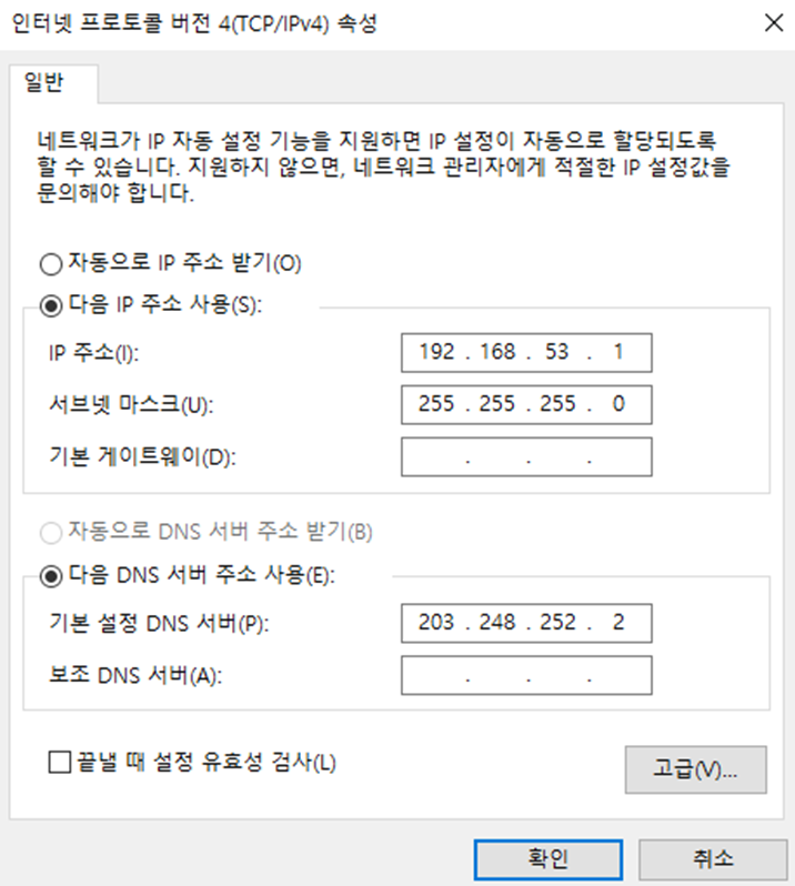 DNS 서버는 LG유플러스(203.248.252.2)로 설정했다.(상황에 따라서 바꾸시면 됩니다.)