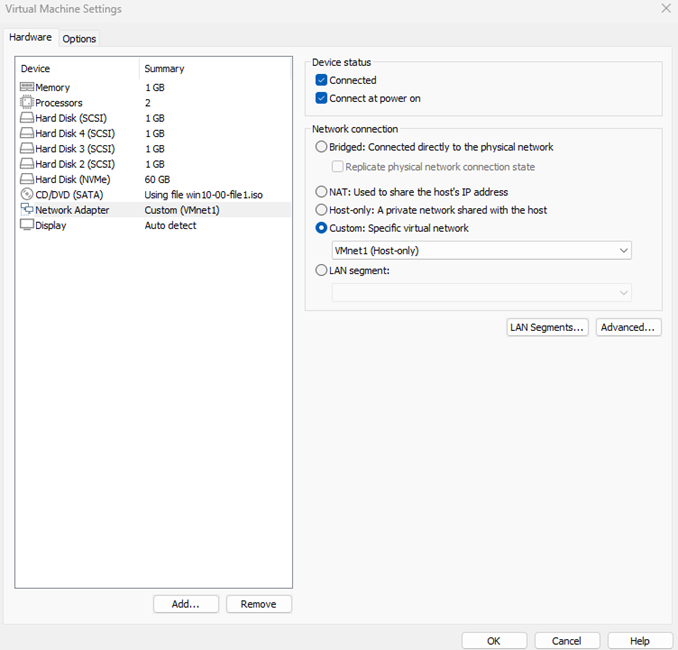 (2-1) VMWare setting VMWare1(WIN10), VMWare 2(WIN2022) 를 vmnet1로 맞춘 상태에서 서버를 연결한다.