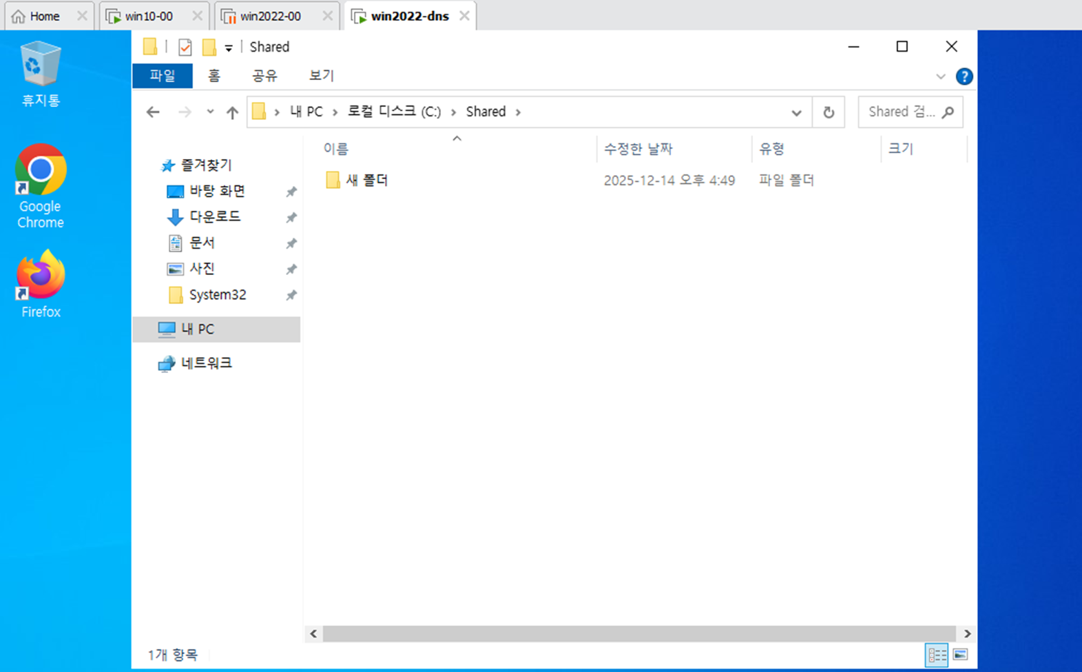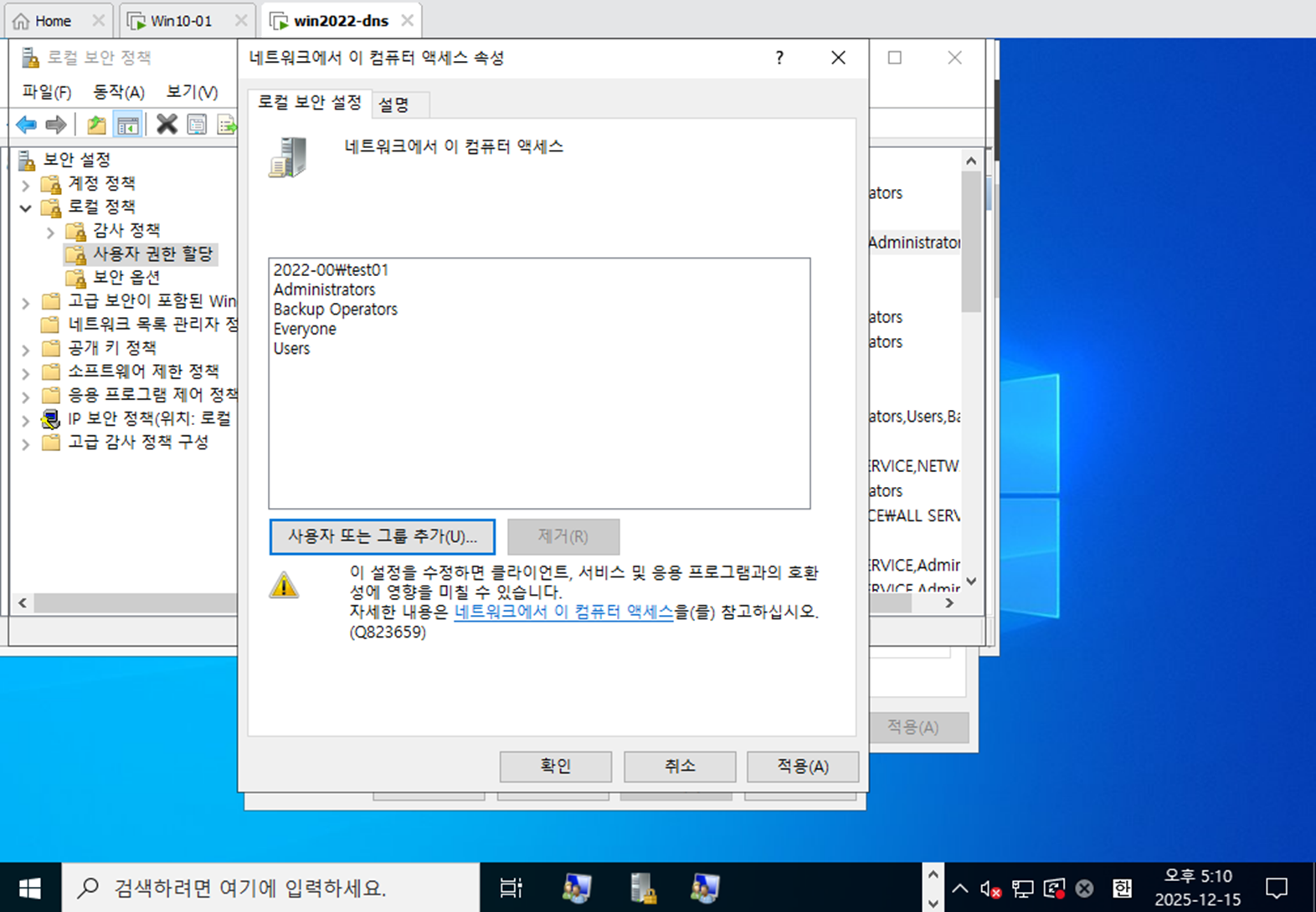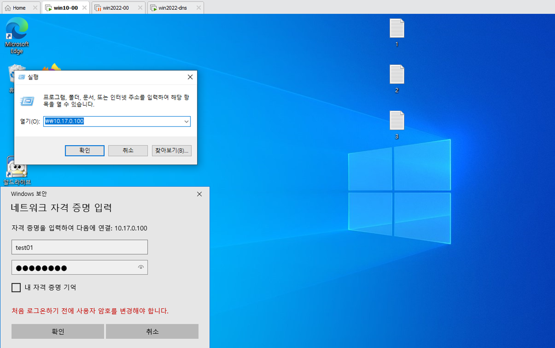 다음 로그온 시 사용자가 반드시 암호를 변경해야 함 체크 / 기간 제한 없음 체크, 권한도 읽기 쓰기 다 있는게 아니다. 현재 상태에서는 test01은 읽기 권한만 있다.
