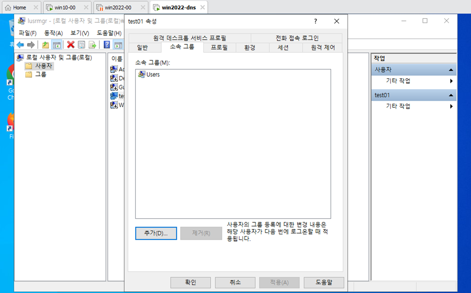 먼저 lusrmgr.msc에서 새 사용자 (test01)를 하나 만든다.