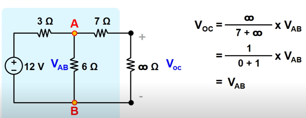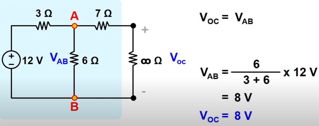 떼어낸 상태로 등가전압 계산. 이때 2ohm은 개방되어 무한대 저항으로 계산