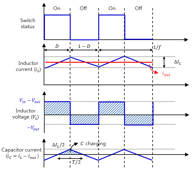 ON 일때의 인덕터 전압 (t = 0 ~ DT) = OFF 일때의 인덕터 전압 (t = DT ~ T)