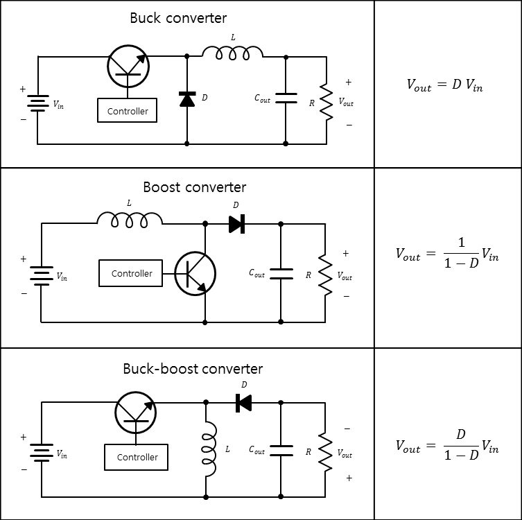 Buck-Boost Converter 는 전압의 극성이 반전되면서 전압을 변환할 수 있는 회로.