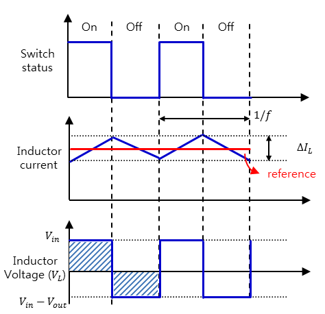 스위치 Off 상태 : (1-D)T 구간 동안 다이오드는 On 상태를 유지하여 인덕터 전류는 선형적으로 하강