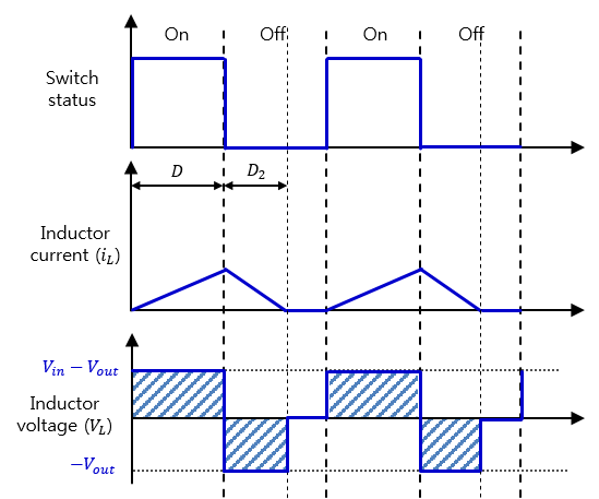 인덕터에 걸리는 전압의 면적(Voltage × Time) 이 한 주기 내에서