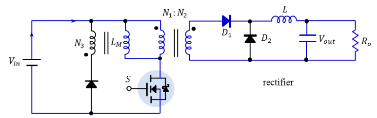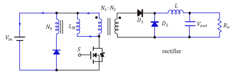 트랜스포머의 자속을 리셋하기 위해 보조 권선 + 다이오드 또는 클램프 회로를 통해 자속이 방전됨.