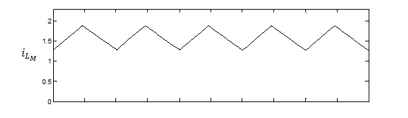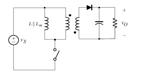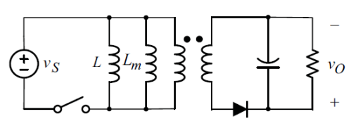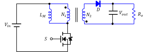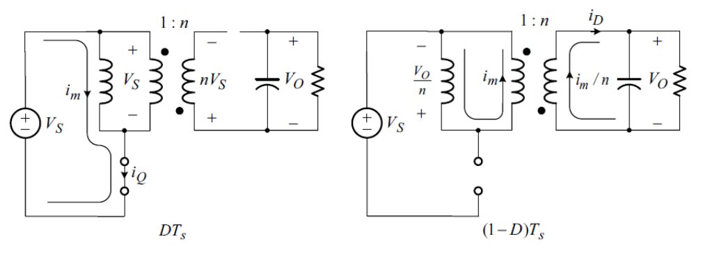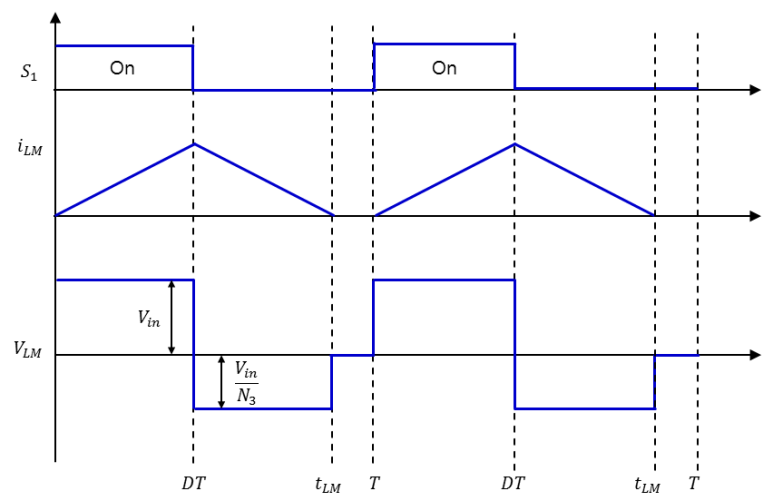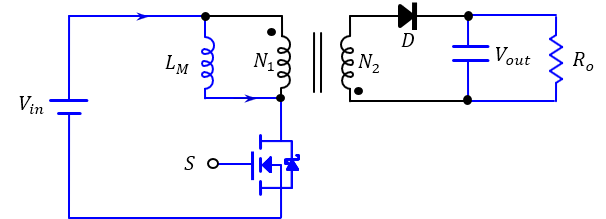 다이오드의 역방향으로 전압이 걸리면서 이상적인 1차, 2차 변압기에는 전류가 흐르지 않고 전류는 1차측의 자화 인덕터에만 흐름