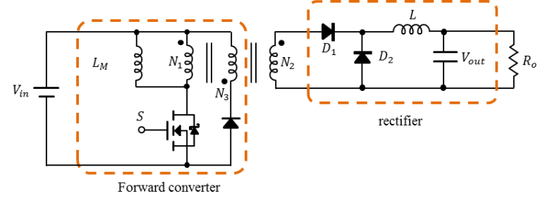 2차측에서 정류 다이오드가 전도되며, 인덕터-캐패시터 필터를 통해 출력 전압이 공급