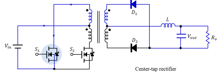 입력 전원 Vin이 S1을 통해 트랜스포머의 1차측 상단 권선으로 흐릅니다.