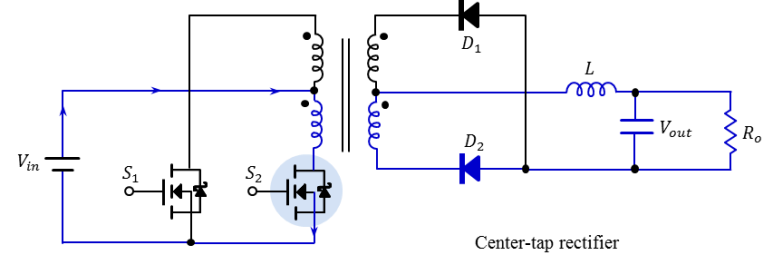입력 전원 Vin이 S2를 통해 트랜스포머의 1차측 하단 권선으로 흐릅니다.