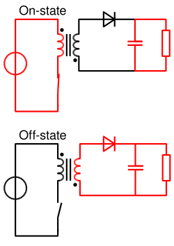 (자속은 반대로 만들어졌지만 2차측 전압은 여전히 정류되어 같은 극성의 출력이 됨).
