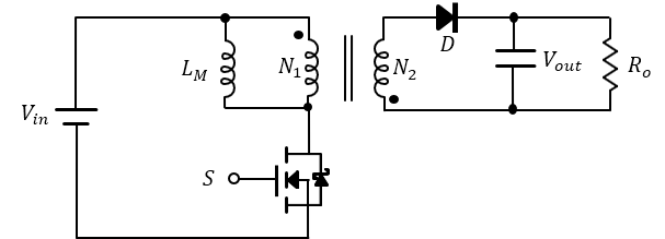 스위치가 켜지면, 1차측에 전류가 흐르며 트랜스포머의 자기장에 에너지가 저장 (인덕터)