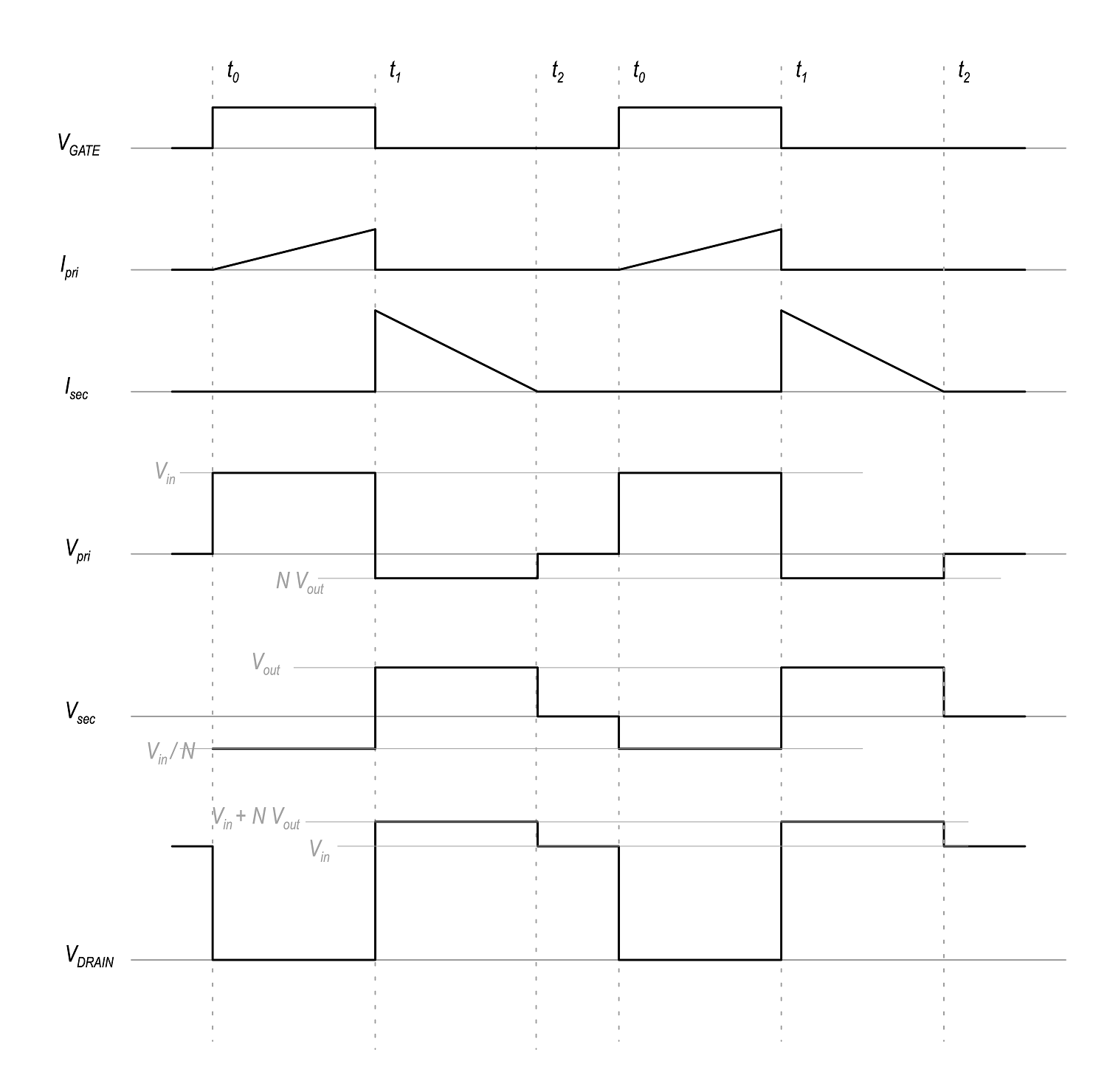 입력 전압이 1차 변압기에 인가, 2차 측에는 턴수비 (n)에 비례하는 전압 걸림. (-nVs)