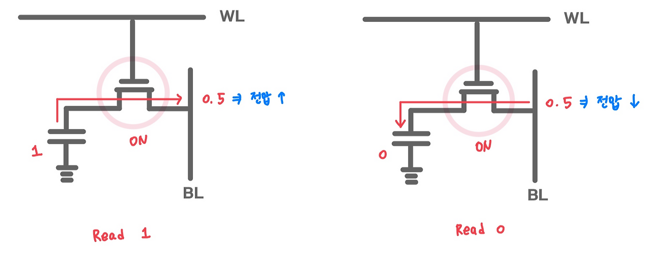 커패시터에 V(H)가 걸려있는 상태라면 전하가 커패시터에서 BL로 이동하면서 BL 전압이 약간 증가함