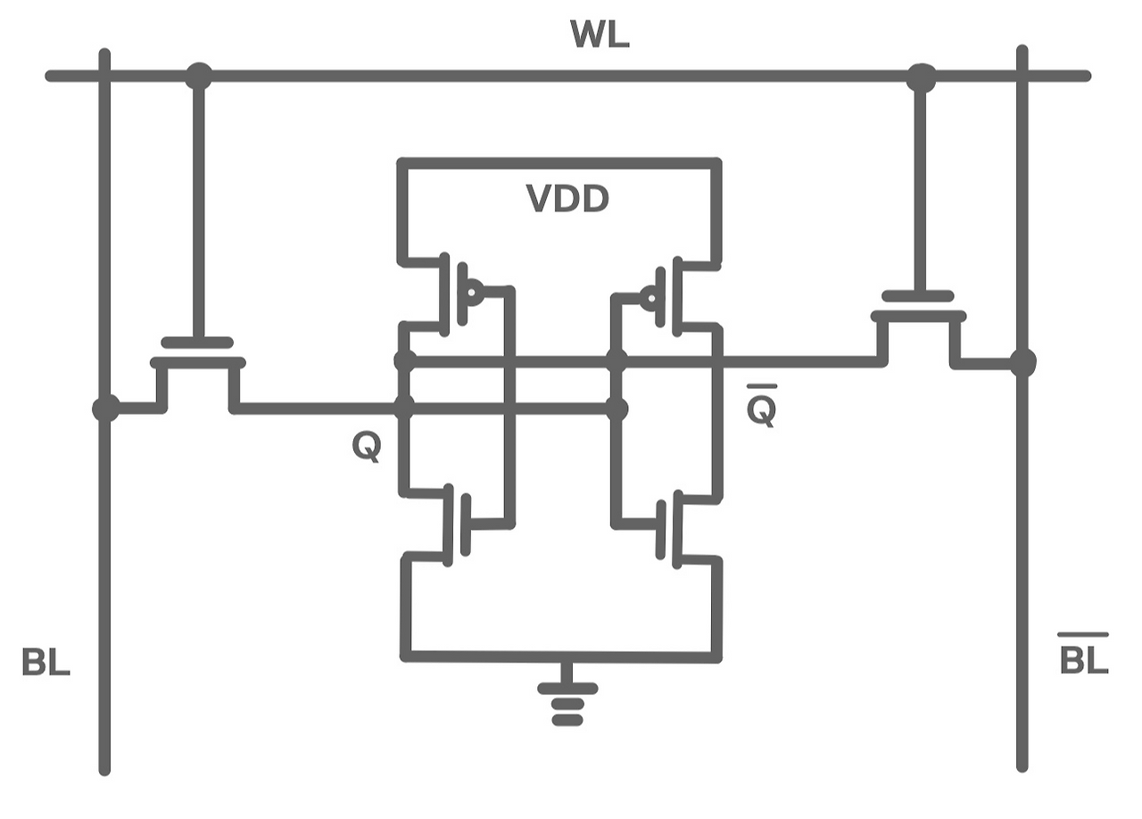 6개의 트랜지스터(6T 구조)로 하나의 비트를 저장