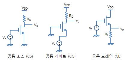 | 공통 소스 (Common Source, CS) | 소스 | 전압·전력 증폭에 적합 (가장 일반적) : 높은 전압 이득, 위상 반전 |