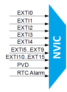 EXTI0 - EXIT4 는 개별 NVIC 인터페이스를 가지고 EXTI5 - EXTI9번은 같은 그룹으로 묶이고 그리고 EXTI10 - EXTI15는 같은 그룹으로 묶여 NVIC에 연결된다.