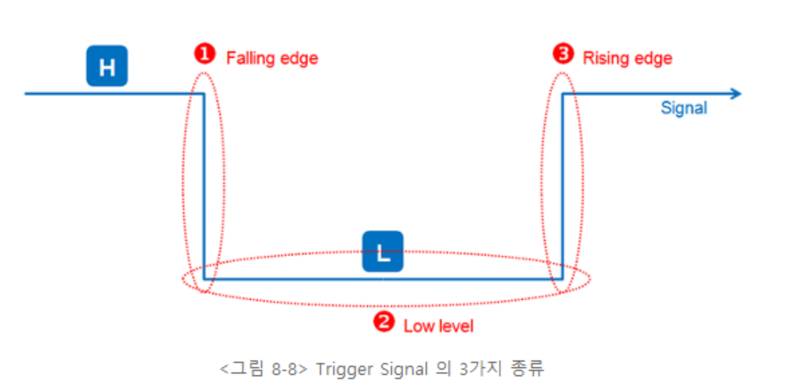 인터럽트를 Rising Edge를 설정하였는데 인터럽트 신호가 LOW레벨에서 HIGH레벨로 변하는 순간을 감지하여 인터럽트를 발생시킵니다.