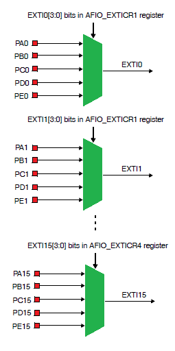 각각의 PA0~PH0 핀이 EXTI0 에 연결되고 PA1~PH1이 EXTI1에 연결되는 식이다.