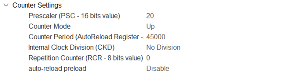 Prescaler = 1+1, Counter Period(AutoReload Register) = 35999 + 1.