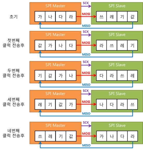 보통 MOSI를 통해 슬레이브에 명령 DATA가 들어오면 MISO를 통해 슬레이브에서 마스터로 응답 DATA가 출력된다.