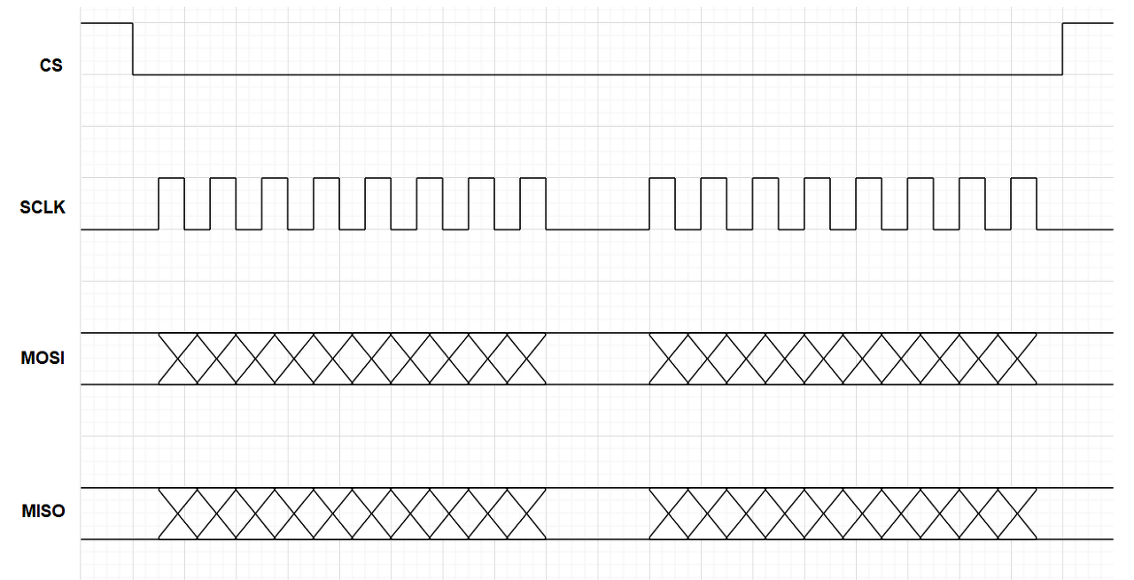 타이밍도를 보면 CS가 HIGH일 때는 동작을 하지 않도록 동기 클락도 생성이 되지 않고 CS가 LOW가 되면 동기 클락이 생성되며 데이터를 주고받는다.