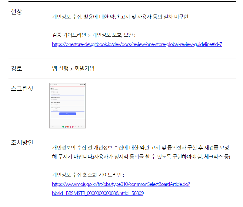 개인정보 수집 동의 체크 박스를 만들지 않아 원스토어 등록에 실패했다.