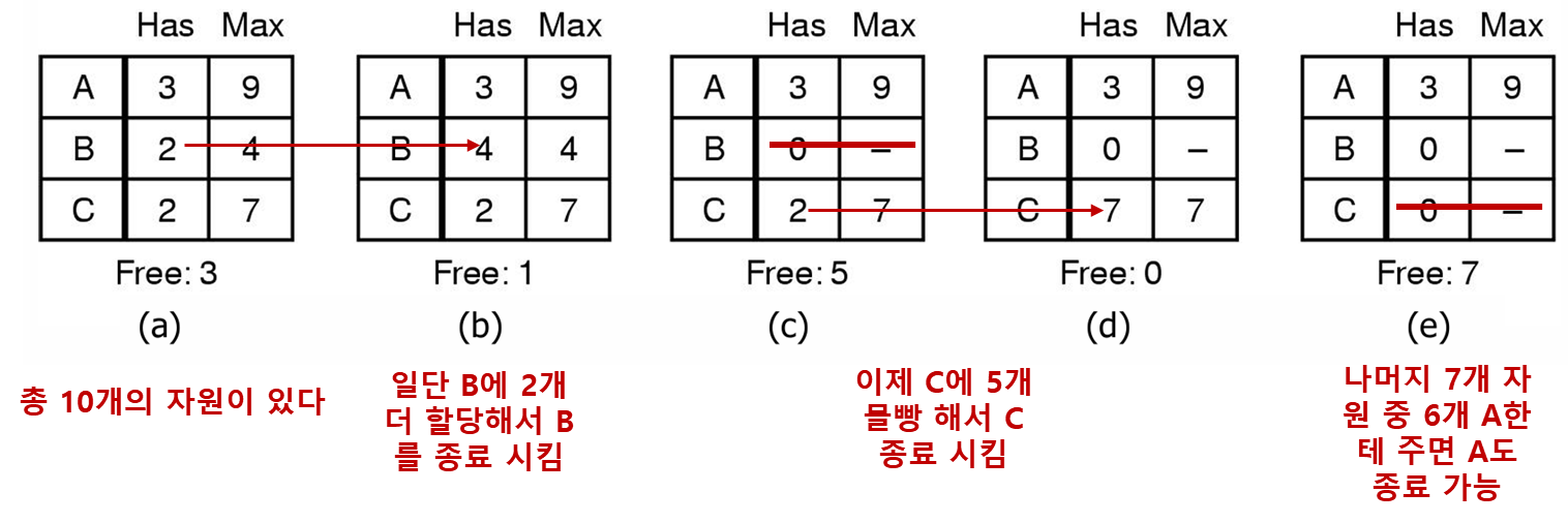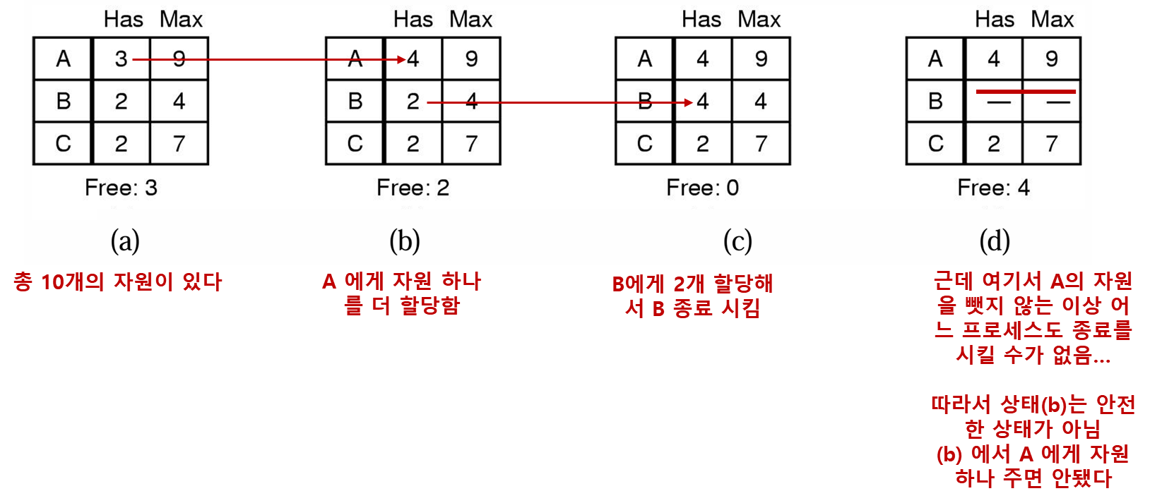 모든 프로세스가 모두 자신이 필요로 하는 최대 수의 자원들을 즉시 요청할지라도 이들이 모두 완료할 때 까지 실행할 수 있는 어떤 프로세스 스케줄링 순서가 존재하면 안전한 상태 라고 말한다.
