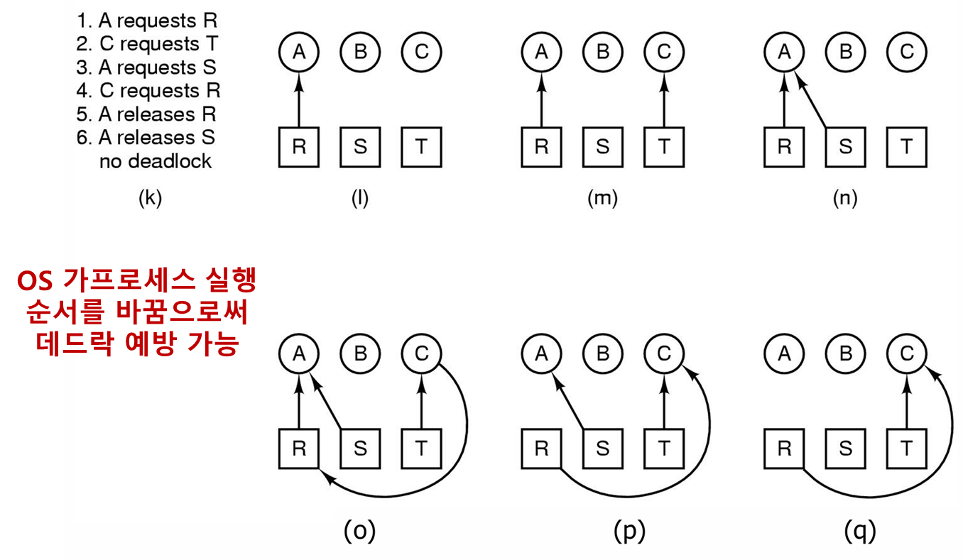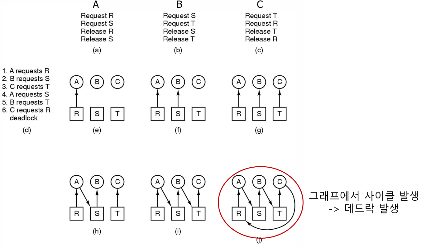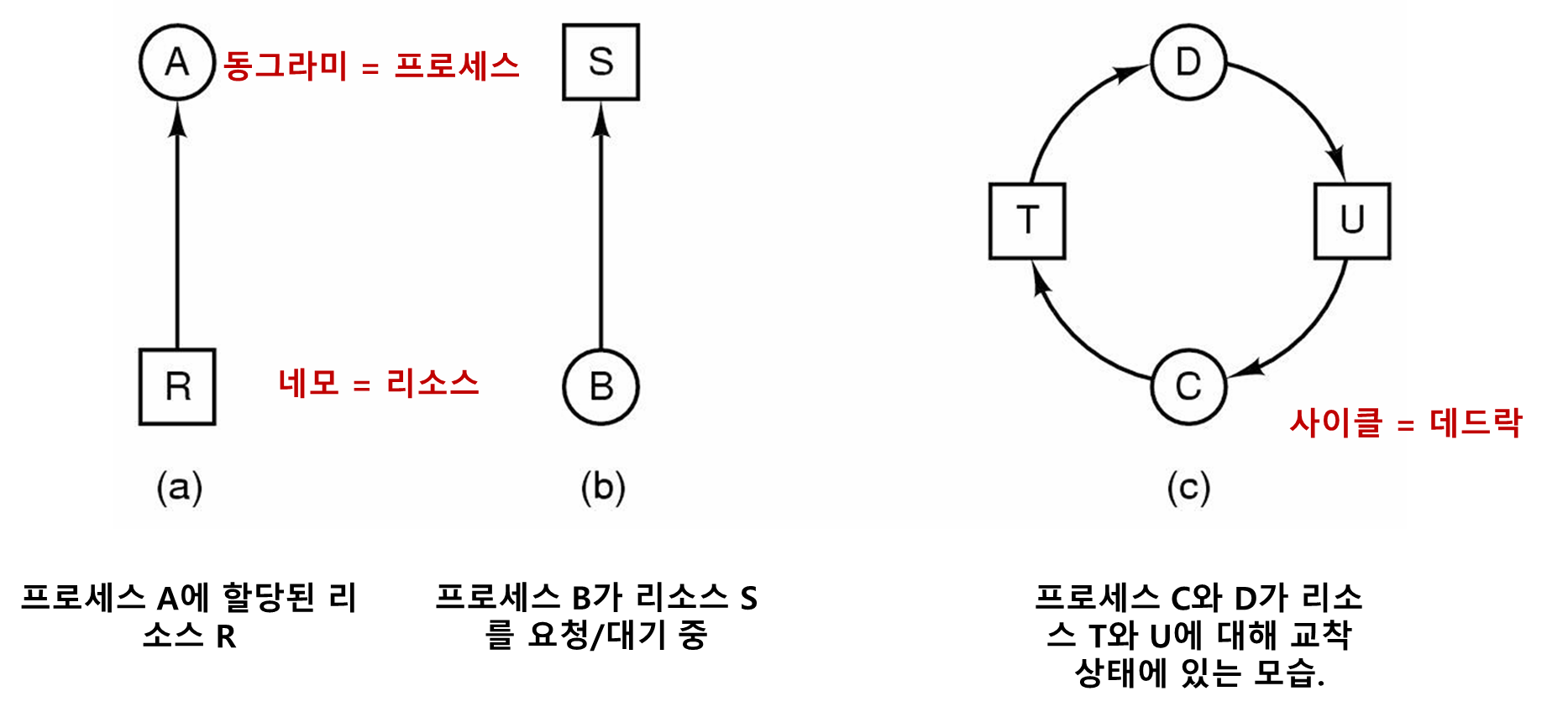 대부분의 경우 각 프로세스가 기다리고 있는 이벤트는 현재 그 집합의 다른 프로세스가 소유하고 있는 어떤 자원 이 반환되는 것이다.