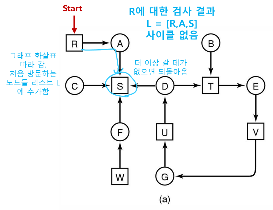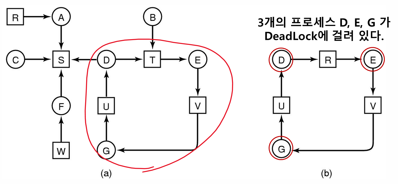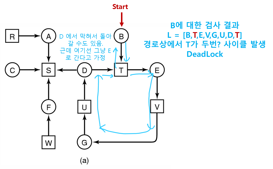 이런 시스템에서 DeadLock을 탐지하는 방법은 앞에서 본 자원 그래프 를 그리는 것이다.