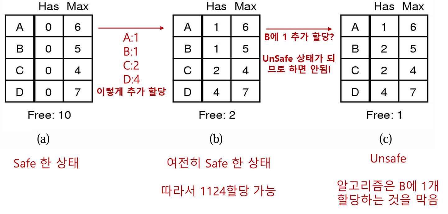 주의할 점은 불안전한 상태라고 DeadLock인 것은 아니다.
