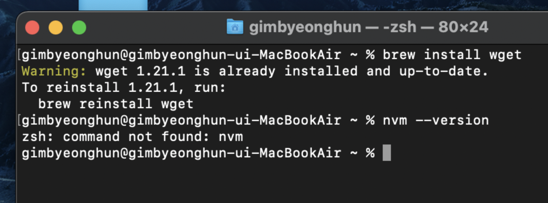 brew를 통해서 chapter를 따라가면서 모든 설치를 끝 마쳤지만 , nvm version이 나오지 않는 상황이 발생했다..내 상황에 대한 설명과 캡처를 아고라 스테이츠에 올리고 혼자 해결을 하다가 크루님께서 디스코드로 연락이 오셨고 알려주실게 많으시다면서 줌에서 많은 이야기들과 피드백을 주셨다. 이 시간동안 package.json이 있는 파일에서 npm 을 실행해야한다는 걸 이해할 수 있는 귀한 시간이었다.이렇게 이미 설치는 되어있다고 떠 있는데 , 터미널을 다시 켜보기도하고 재부팅도 시도했지만 오류가 사라지지 않았다. 그런데 환경 변수에 들어가서 확인해보니 구글링에서 && \ . 사이에 \가 빠져있어서 그걸 지우고 :wq로 나왔더니