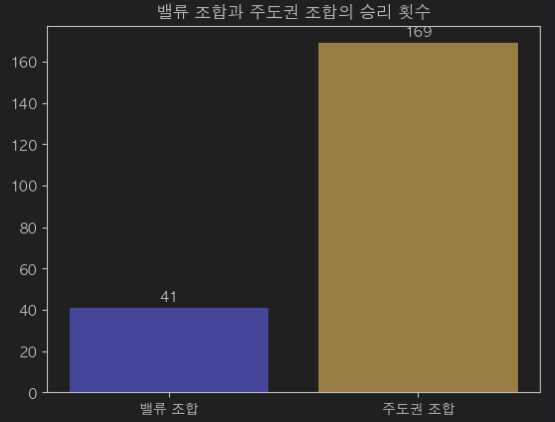 전체 데이터가 210개인데 압도적으로 주도권 조합의 승리 횟수가 높았다.