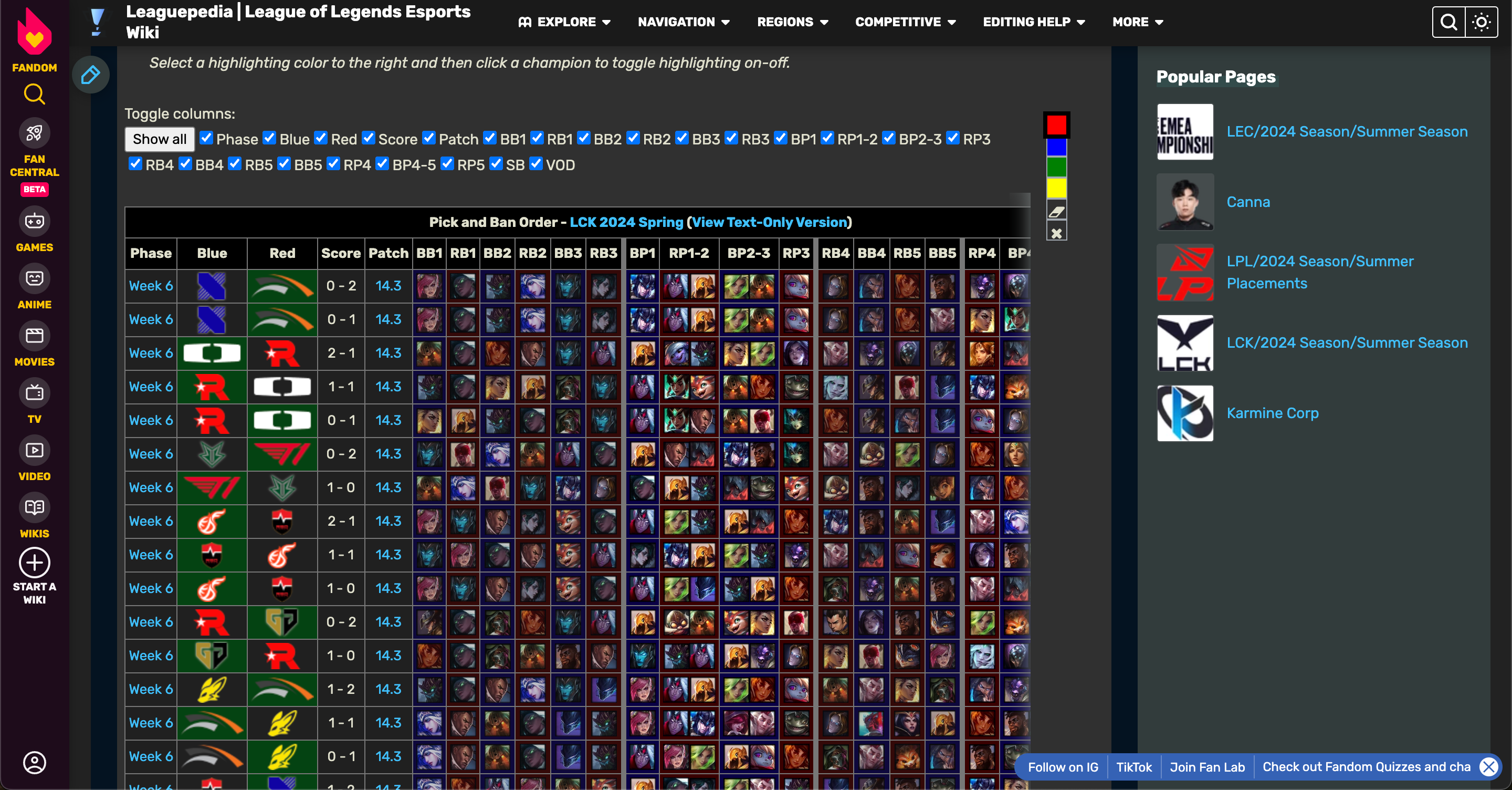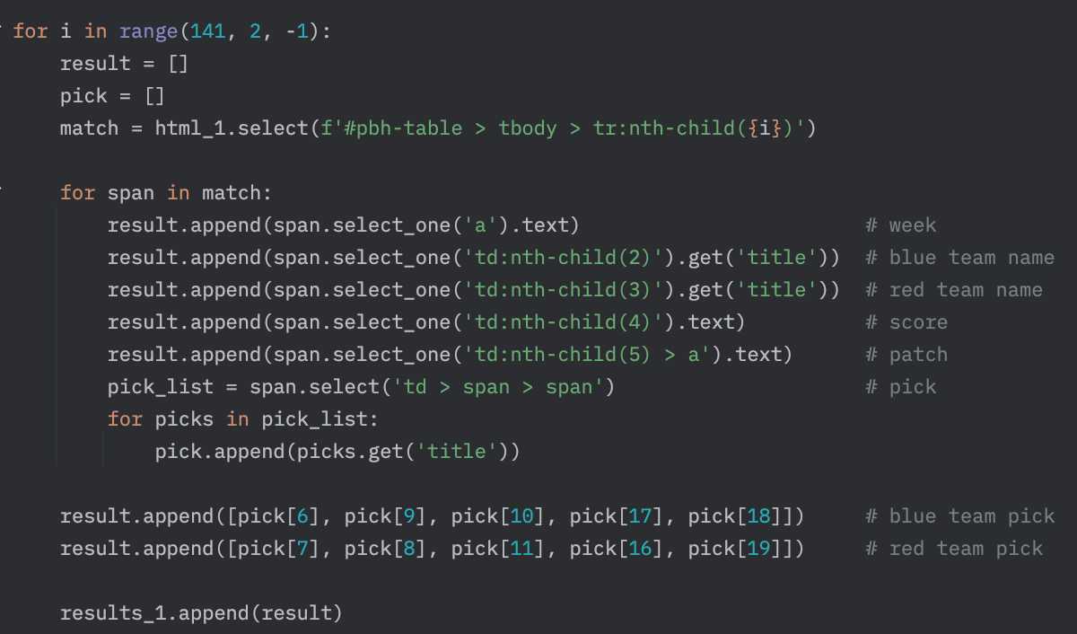 데이터 수집은 lol.fandom.com에서 진행했다. 필요로 했던 매치별 밴픽, 스코어 등 분석에 필요한 정보들을 모두 가지고 있었다.