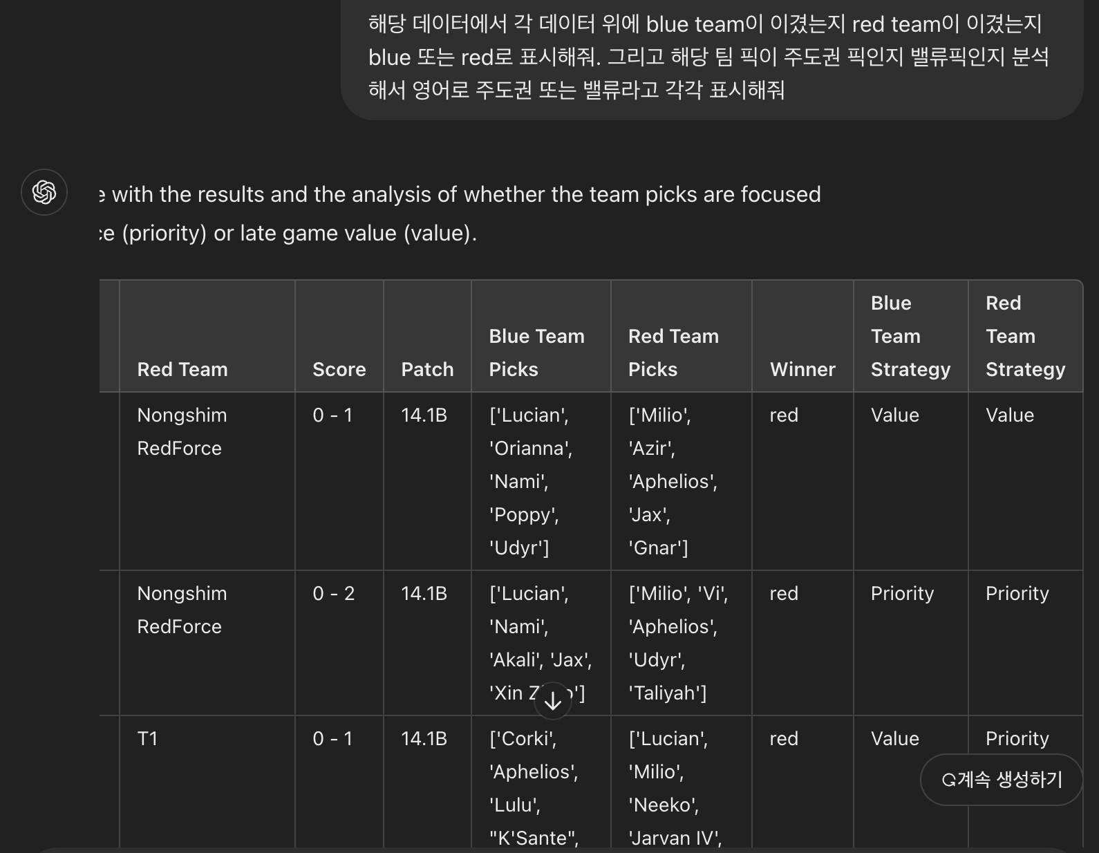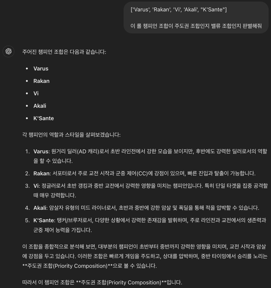 위와 같이 프롬프팅을 통해 조합 판별을 할 수 있었고 프롬프팅 노가다를 통해 약 210개의 매치 데이터의 조합 전략 데이터를 수집할 수 있었다.
