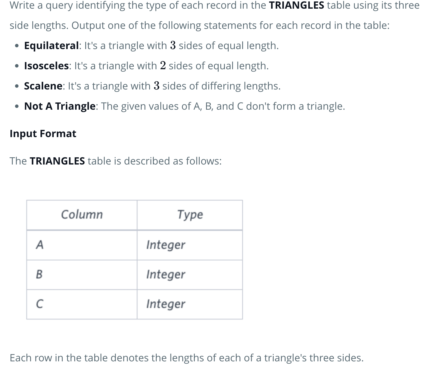 TRIANGLES 테이블에서 3개의 변을 나타내는 칼럼들을 가지고 조건을 만족하는
