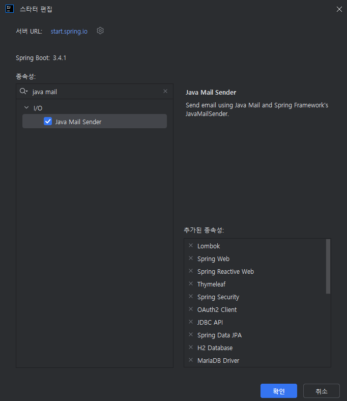 스타터 편집으로 사진과 같이 Java mail Sender을 추가 해주거나