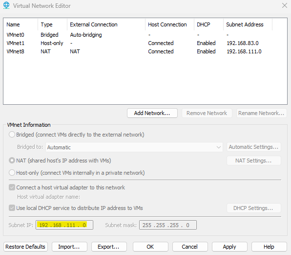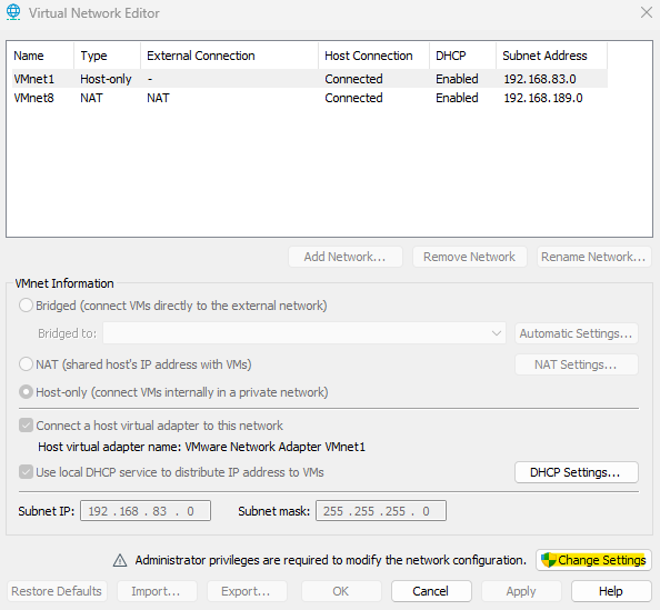 VMware Worksation Pro -> Edit -> Virtual Network Editor -> Change setting