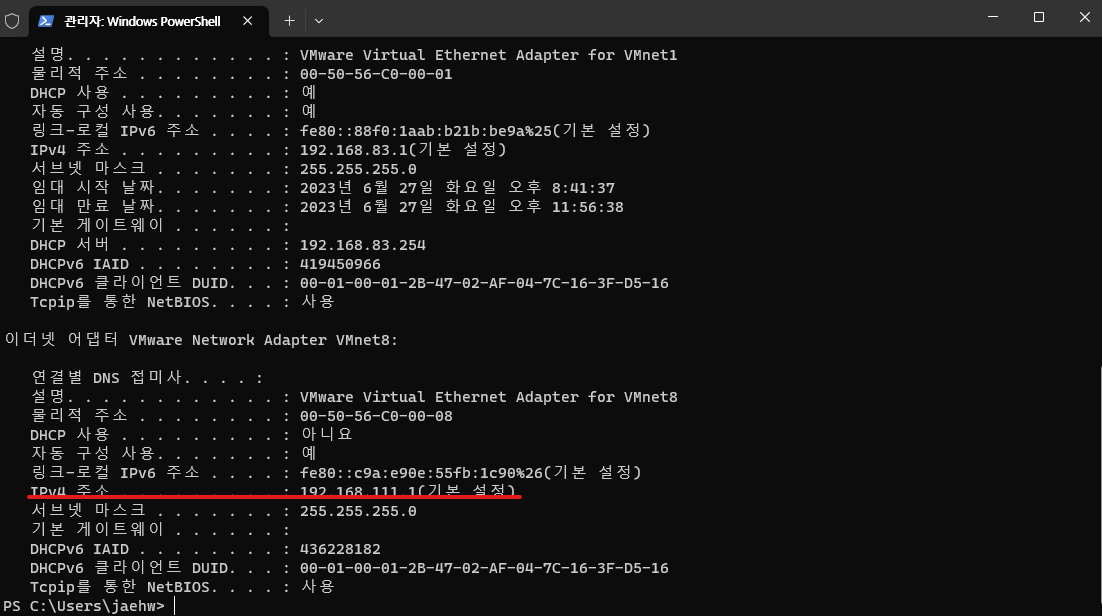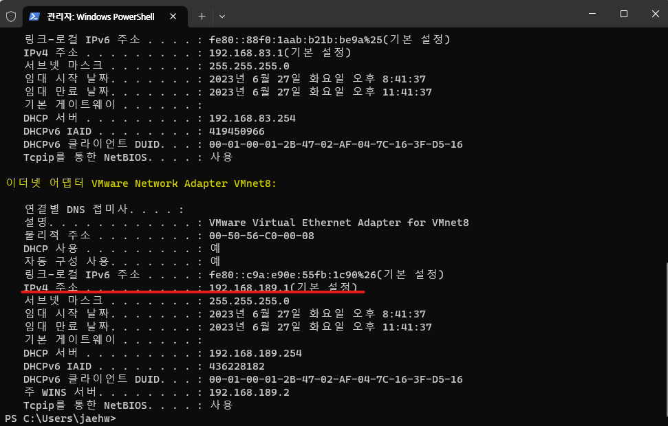 윈도우 11 기준 : 시작버튼 (우클릭) -> 터미널(관리자) -> Windows PowerShell 실행 -> ipconfig /all