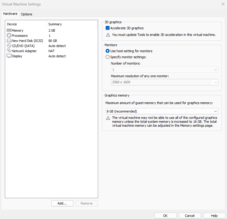 사양 조절 : edit virtual machine setting