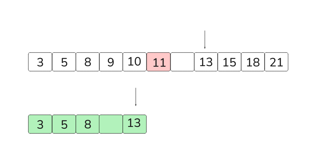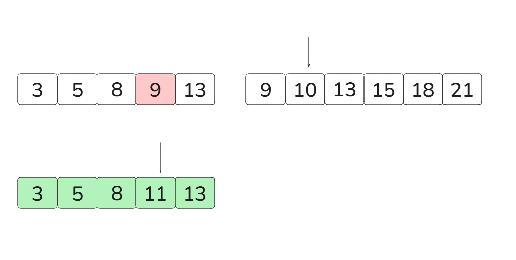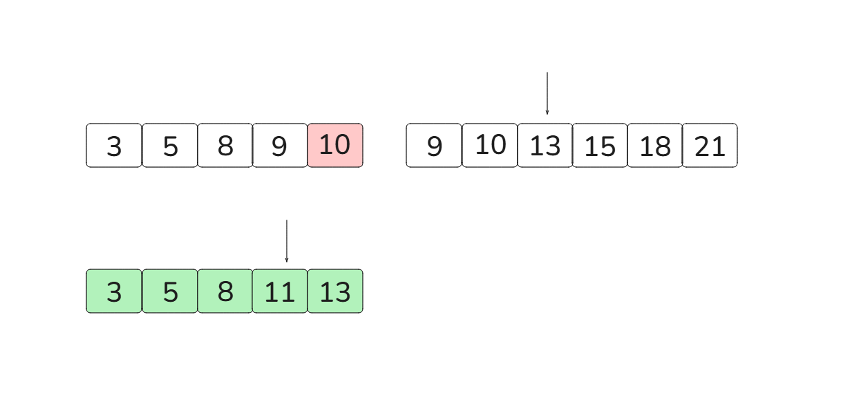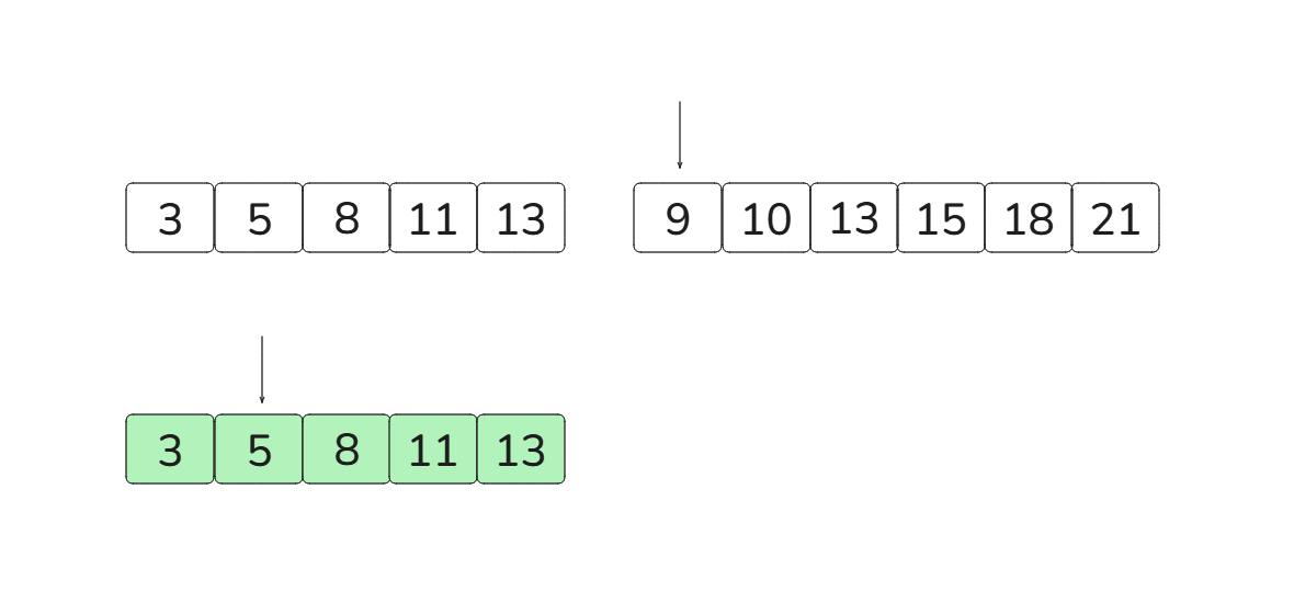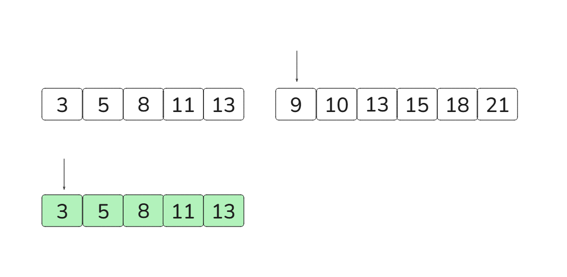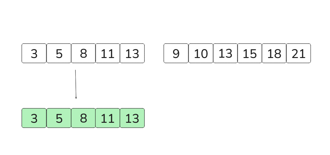 [3, 5, 8, 11, 13][9, 10, 13, 15, 18, 21]이때 run A의 크기가 더 작기 때문에 runA를 복사합니다